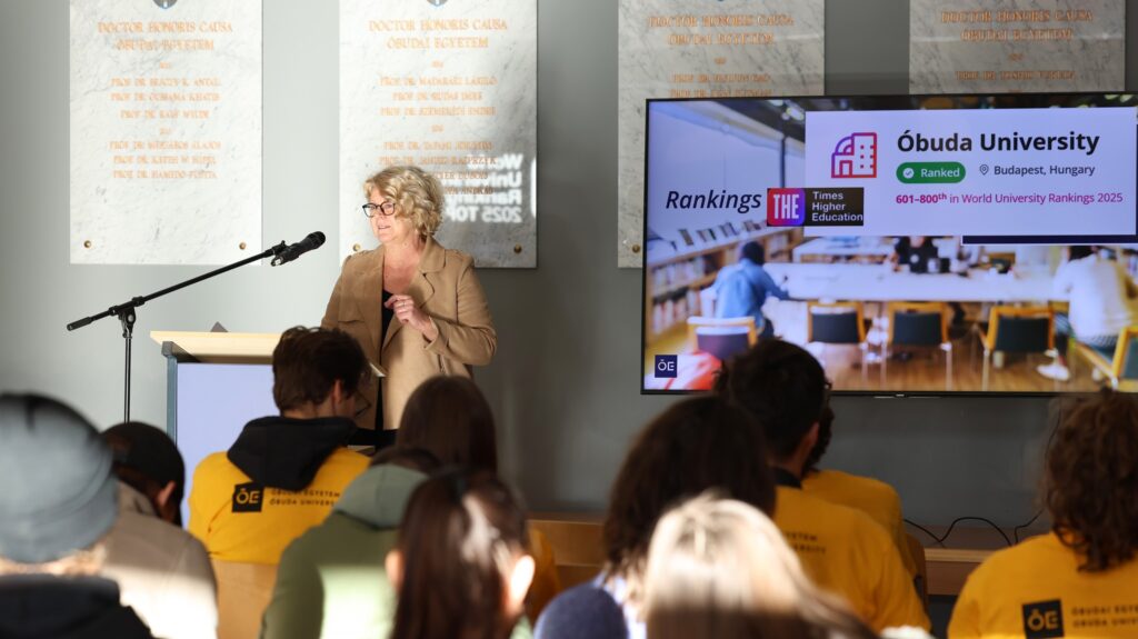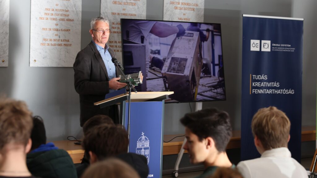 Óbudai Egyetem főépületének aulájában, ahol három középiskola diákjai vettek részt a Fenntarthatósági Fesztivál elnevezésű programon.